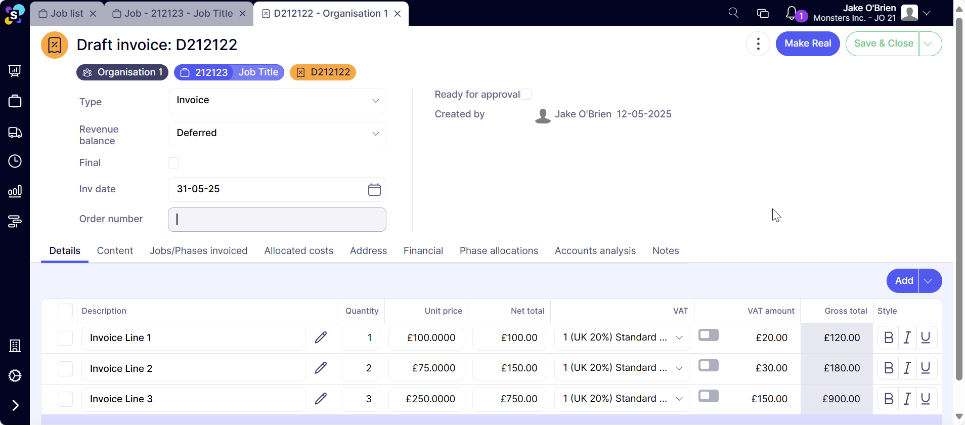 Selecting New Invoice will then take you through to the details tab of a draft invoice. All invoices will have a common set of tabs, but depending on your system setup you may not see all the same fields or tabs as displayed here: