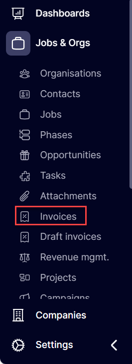 Invoices and draft have their own table available via the left hand navigation panel, though it is important to note invoices can only be filtered and viewed from here, not created: