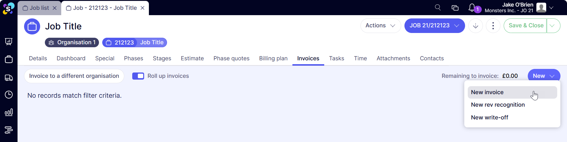 The invoices tab will display any real or draft invoices relating to the job including credit notes and write offs. The display option defaults to roll up, but this can be expanded to show phase level. The default VAT new invoices, taken initially from the client record, is also displayed and can be amended via the drop down. Anything in draft status can be edited from here and new invoices generated: