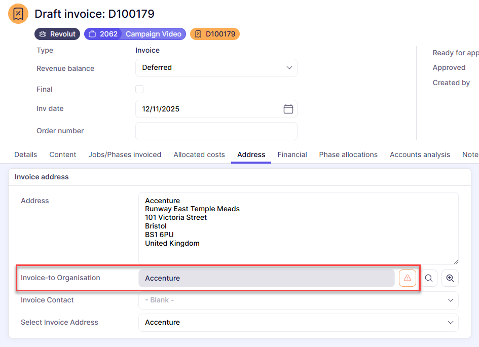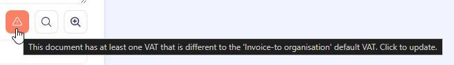 The orange warning triangle indicates that at least one VAT code on this invoice is different to the default VAT code for the chosen Invoice-to organisation. Clicking the icon will update all VAT codes to match the default for the new Invoice-to organisation: