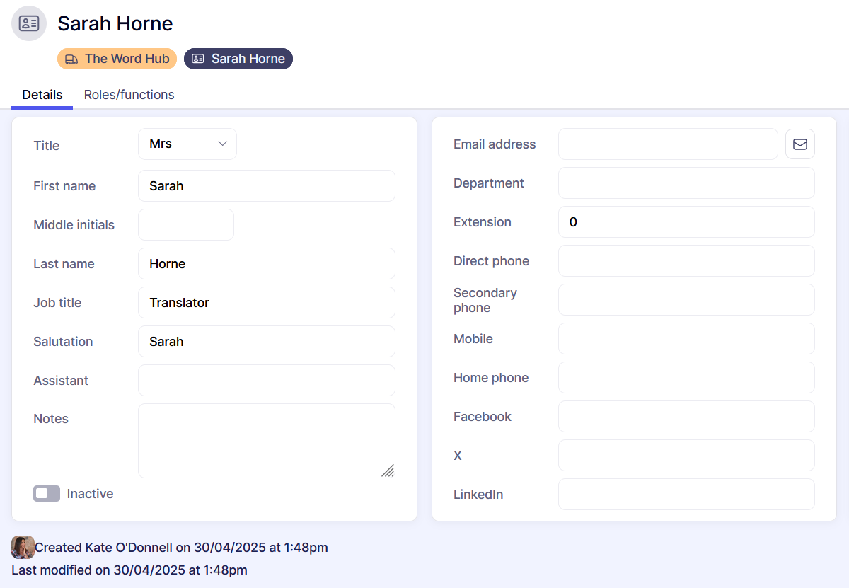 The list of contacts displays basic information and has various controls common to lists in Synergist, read more about common user interface controls in this article. Click on an item in the list to open the detail input form for that contact in a new tab in the main interface: