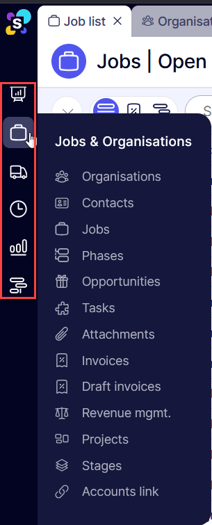 Down the left hand side of your window you will always see a navigation bar. This is the main tool used to find your way around and open new work areas. The default display for this is minimised, you will only see icons to represent what lists and features are available in each. Hovering your mouse over each icon displays all the menu options availabe under the section name - clicking on one will open the list / feature.