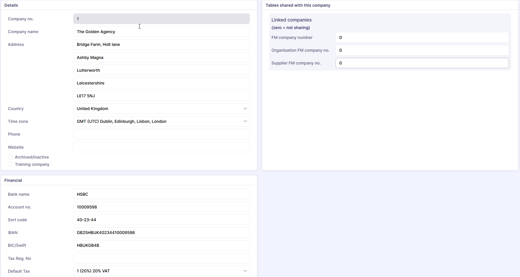 If you have multiple companies set up it is possible to use another company's data for certain File Maintenance (FM) tables. Otherwise leave these fields at zero.