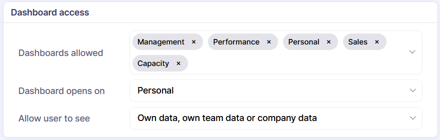 The Management, Performance and Sales dashboards all allow filtering by my team, current user or other team, in addition to a view for the whole company.