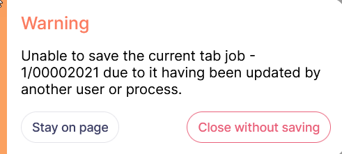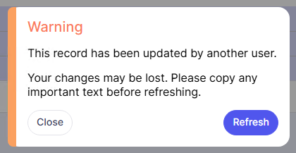 You must refresh the record to get the latest saved version of the record. Record saving is happening very often in main records like job header, job phase, organization etc, so losing changes made should not be a cause for concern. If you have entered a lot of text into a field on screen you can close the warning and copy your text to clipboard before refreshing the record.