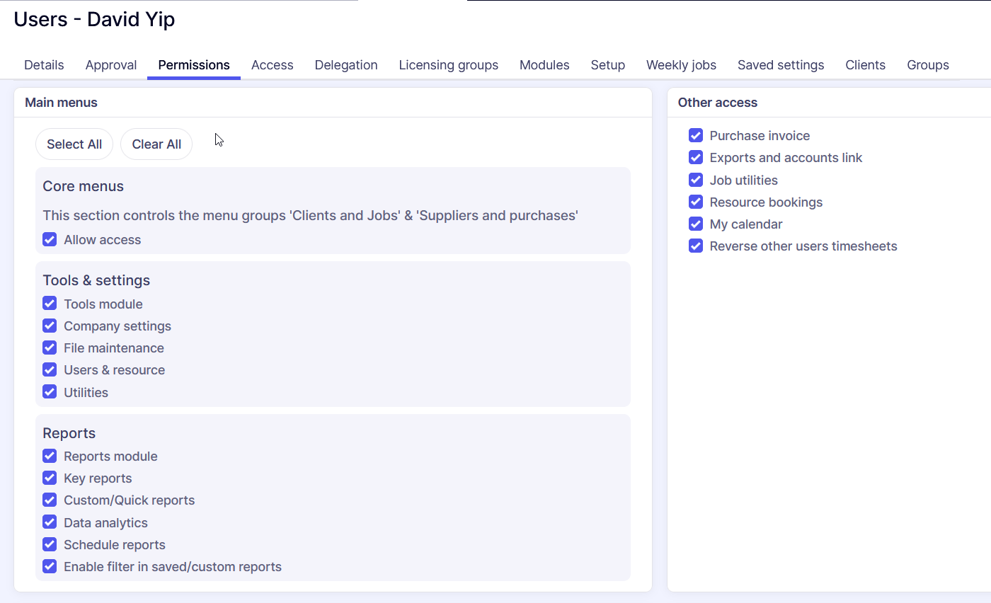 Any amends that need to be made to a user, such as their access to certain areas of Synergist, the viewing of data or their approval levels can be made via their user account.