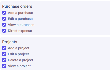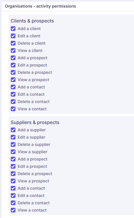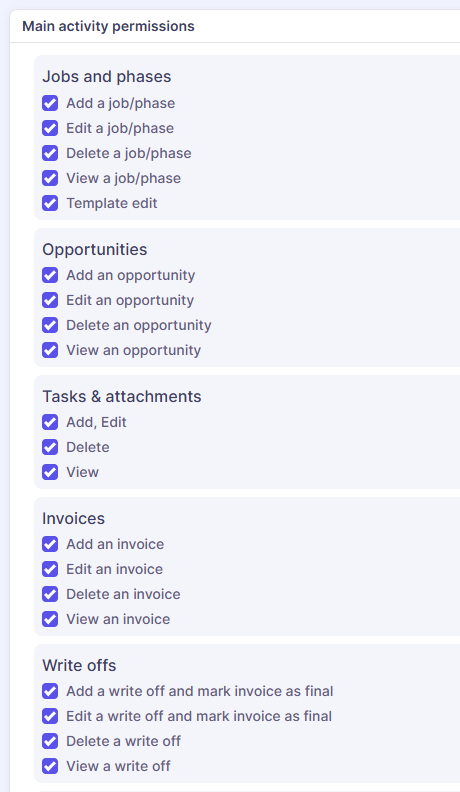 All the other add / edit / delete / view permissions are listed below the main menus permissions: