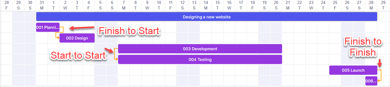 - Finish to start - drag the finish circle from task 1 to the start circle on task 2