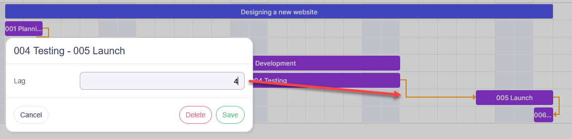 A delay before the dependent task date can be added by double clicking on the link line in the Gantt chart. This interface can also be used to delete unwanted dependency links.