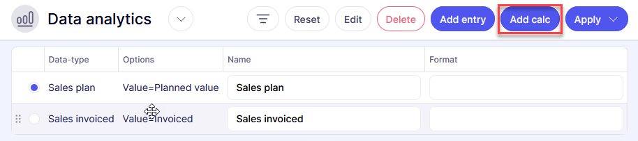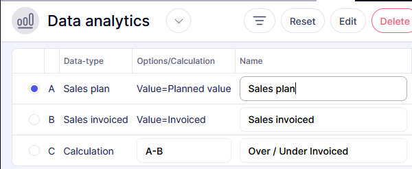 For example if you wish to see the difference between planned and actual billing in a period you can add the normal data series' for billing plans - planned value, and sales invoices - invoiced amount. To add a calculated column that is the difference between the two just click to add a calculation.