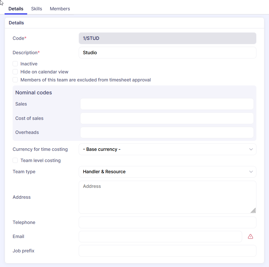 Most fields are self-explanatory. Nominal codes should only be filled in if you intend to analyse sales & purchases based on the handler team assigned to jobs.
