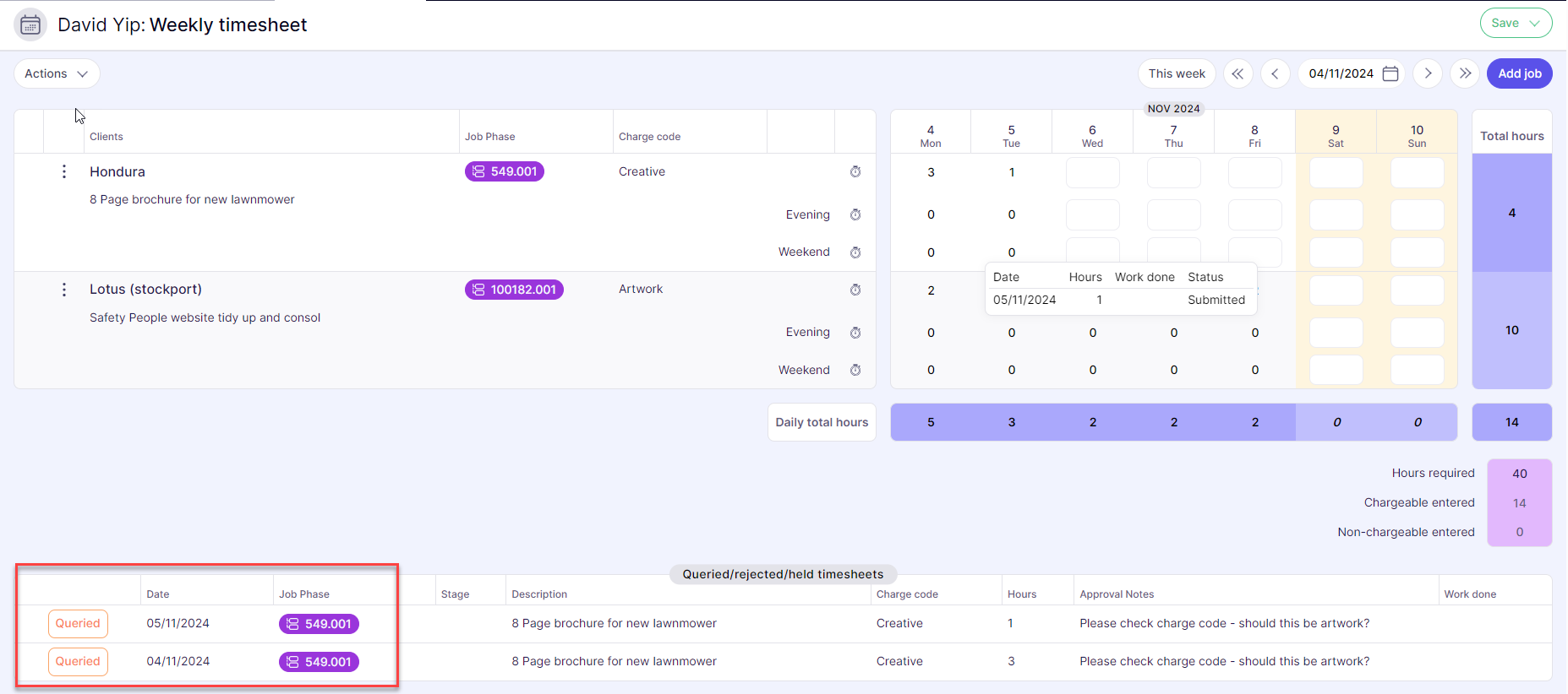 Queried and rejected are the only two actions that then require further input from you and they will appear at the bottom of your timesheets: