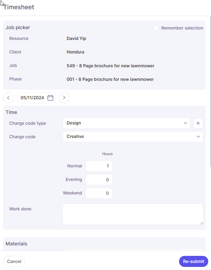 At this point, you can amend any part of the original timesheet from chargecode onwards - ie it has to remain for the same job / phase / stage (if applicable). Equally if there are no amends and you wish to resubmit as stands, this is also fine.