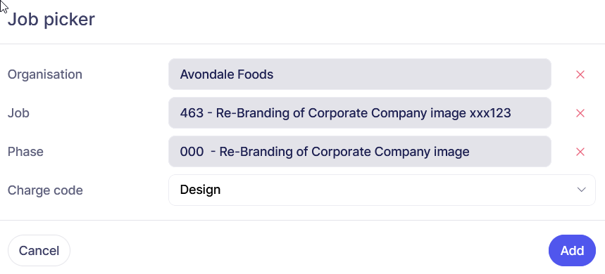 Adding a job phase can be done one at a time from the 'Add job' button in the top left corner, which takes you through to select the job / phase / stage (if applicable) / charge code to add to the table: