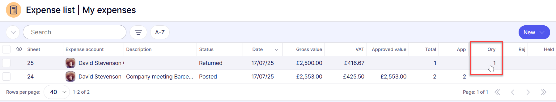 Queried expenses will appear in your expenses view with the number of lines noted in the queried column. If an entire sheet has been returned the status column will reflect that:
