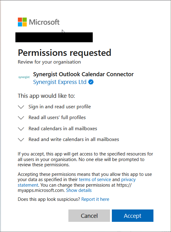 Click Authorise Outlook Calendar. No bookings are synced at this point. Click the start synch button to display a warning: