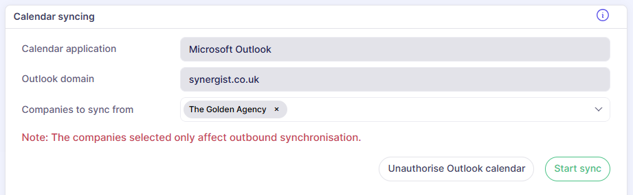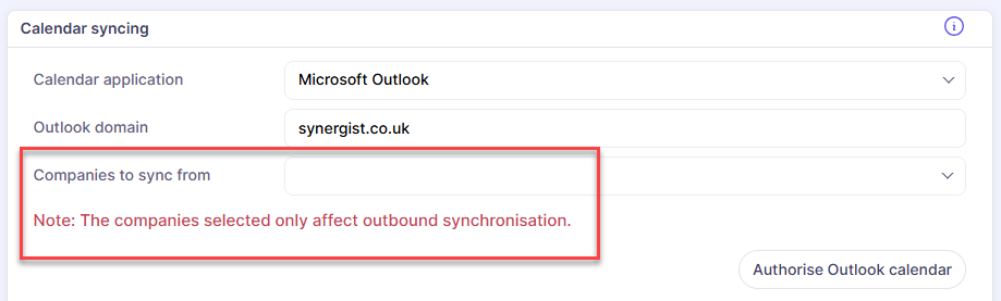 Once connected you must choose which Synergist companies you wish to sync Synergist bookings from into Outllok.