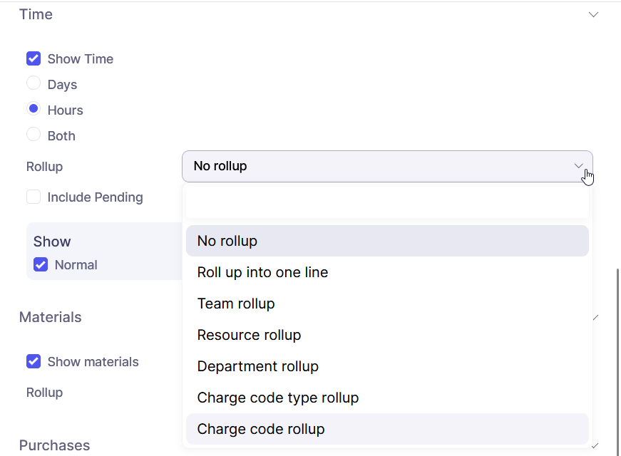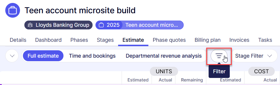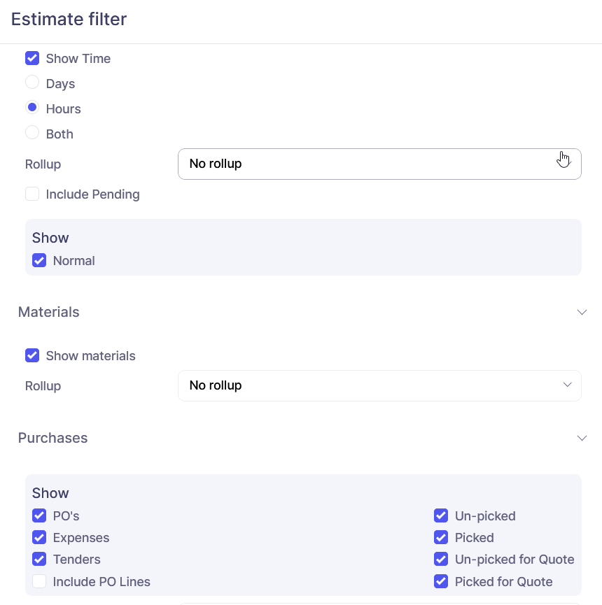 Alongside these controls are options that change the level of detail displayed. Typically used to roll up time estimates, but roll up options are also available for materials and purchase / expense lines.