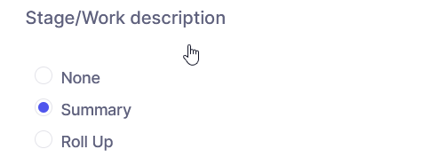 Summary includes a narrative line for stage description and lists estimate lines associated with that stage, rolled up according to your other settings made here.