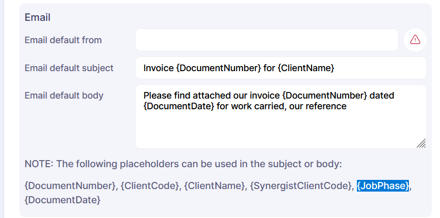 The placeholder is replaced by the relevant data when the email is generated by Synergist.