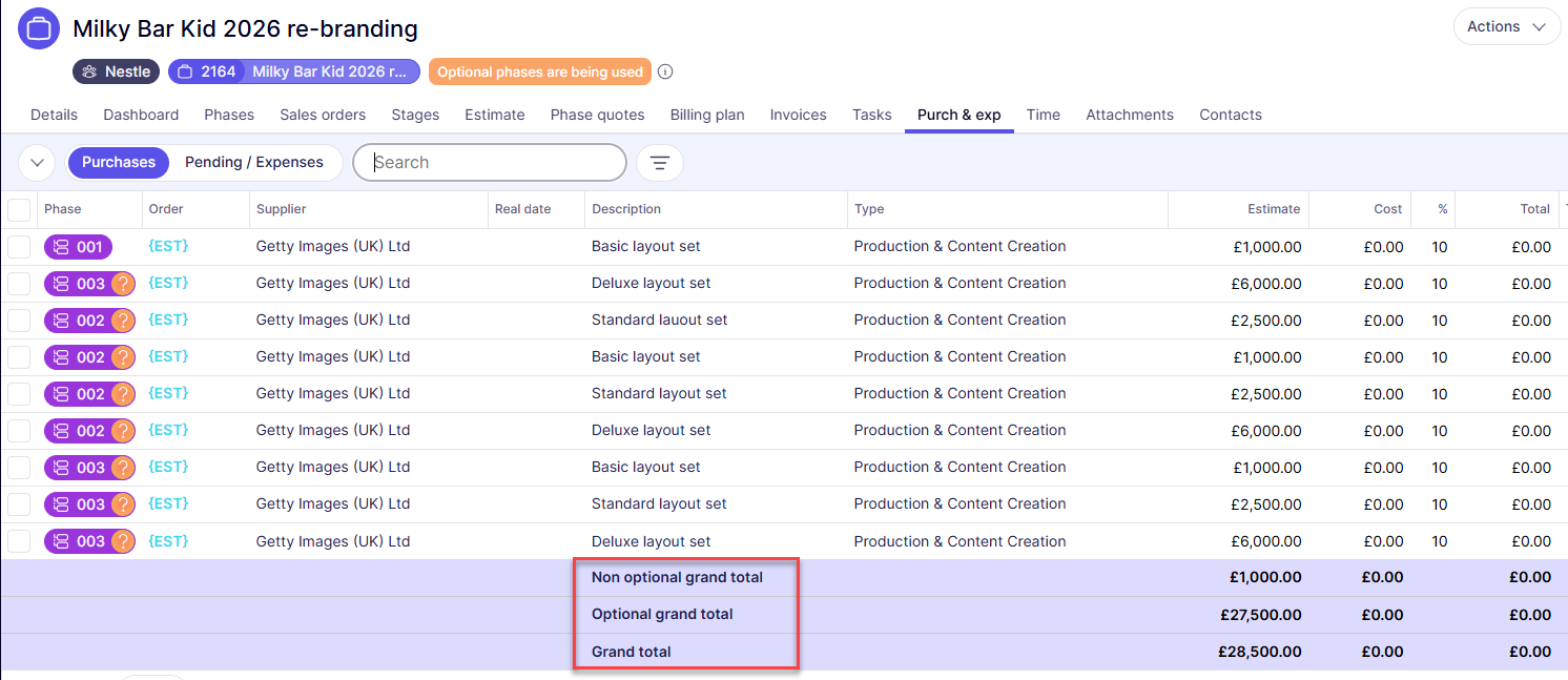 Job level views of time, material and purchases / expenses have totals indicating optional / non optional phase totals: