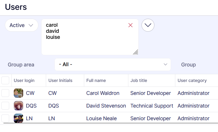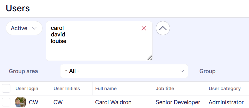 Searching for items in file maintenance tables allows entering multiple values and searching for them all. Particularly useful in tables with a lot of entries, specifically Users.