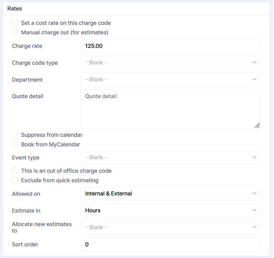 Manual charge out for estimates. This option can only be ticked on charge codes that have not been used on an estimate or added to an organisation rate card. This is a special type of charge code used in Departmental Revenue Analysis for either adjusting charge out values on a phase, or for transgerring charge out amounts between departments. See this article for more information on Departmental Revenue Analysis.