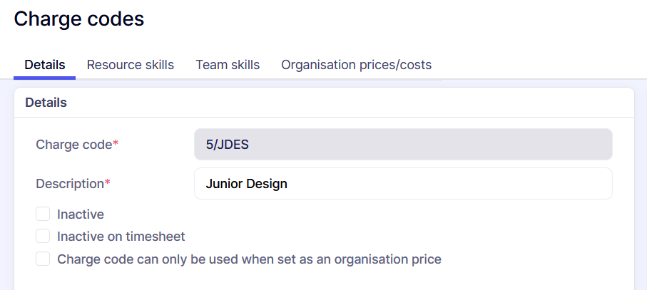 Charge code can only be used when set as an organisation price. This setting allows you to restrict certain charges for use on jobs for specific organisations. Until a charge code with this flag is added to an organisation rate card it cannot be used for estimating or timesheet entry on jobs for that organisation.