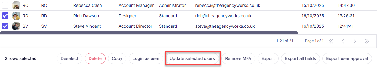 Or you can change the setting for multiple users by selecting them from the list and choosing update from the actions bar: