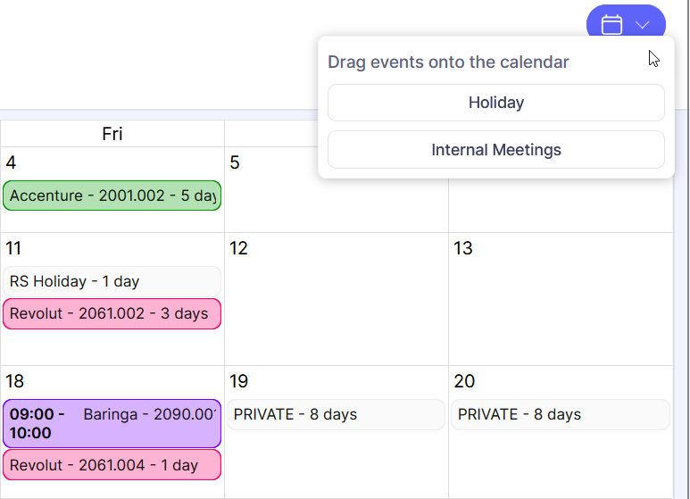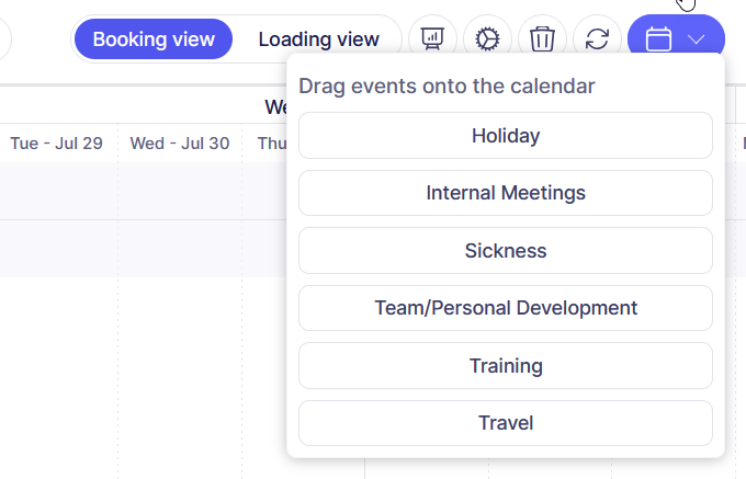Holiday events are a convenient way of booking time into a resource calendar for holidays. You will need a job / phase / time estimate that is linked to a holiday event type. Once that is done you can drag and drop holiday events into another resource's calemdar via Resource Bookings, or into you own calendar via My Calendar.