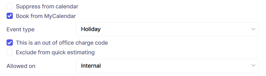 - A single internal job and several charge codes to represent holiday, admin, meetings etc.