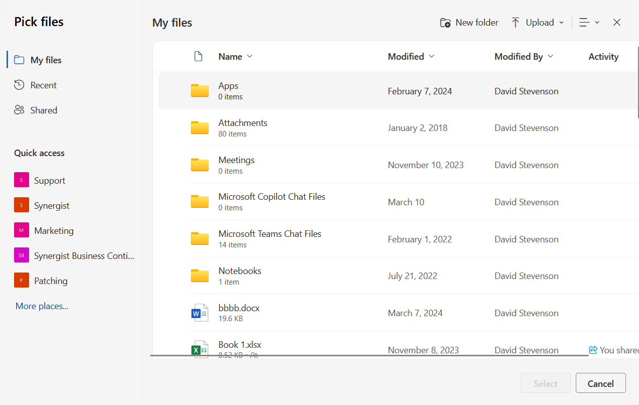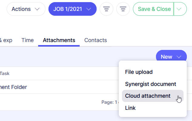 The user can now select files from the authorised cloud providers and attach these to records in Synergist. On the Attachments tab of a record, click New > Cloud attachment