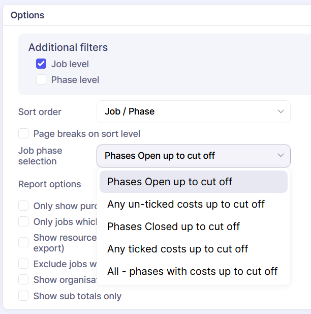 - Phases open up to cut off compares the phase (not job) final invoiced date with the cut off date. Any phases with final invoiced dates up to (and including) the cut off date are included, irrespective of them having any WIP to report