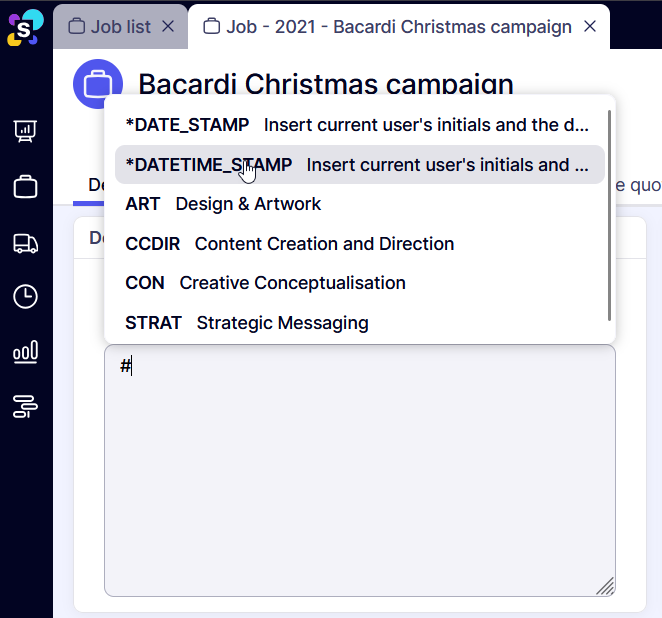 Both Date stamp and Date time stamp come as standard (though can be deleted if not desired) and new items can be added: