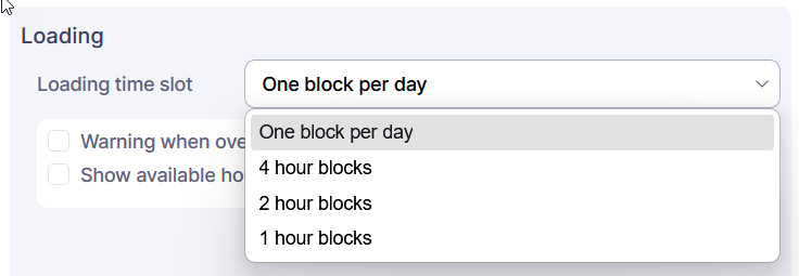 As in other calendar areas the loading view can be displayed in single day, daily, weekly or monthly views. For daily view it is possible to view the blocks singularly or in different slots - for example 2 hour slots. To change this setting go to Preferences in calendar bookings > Loading time slot.