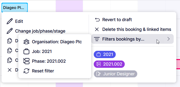 It is possible to filter the calendar view so that only bookings for a particular client/job/phase/stage are displayed (stage will only be available on bookings to 2 tier jobs). This is done using the right click on an existing booking within calendar bookings and mousing over 'Filter bookings by':