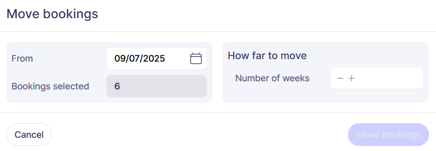 Moving bookings: Selecting this option will open up a dialog box. You can choose to move the bookings in the current filter forward or backwards a number of weeks. The system defaults to only selecting items from today’s date.
