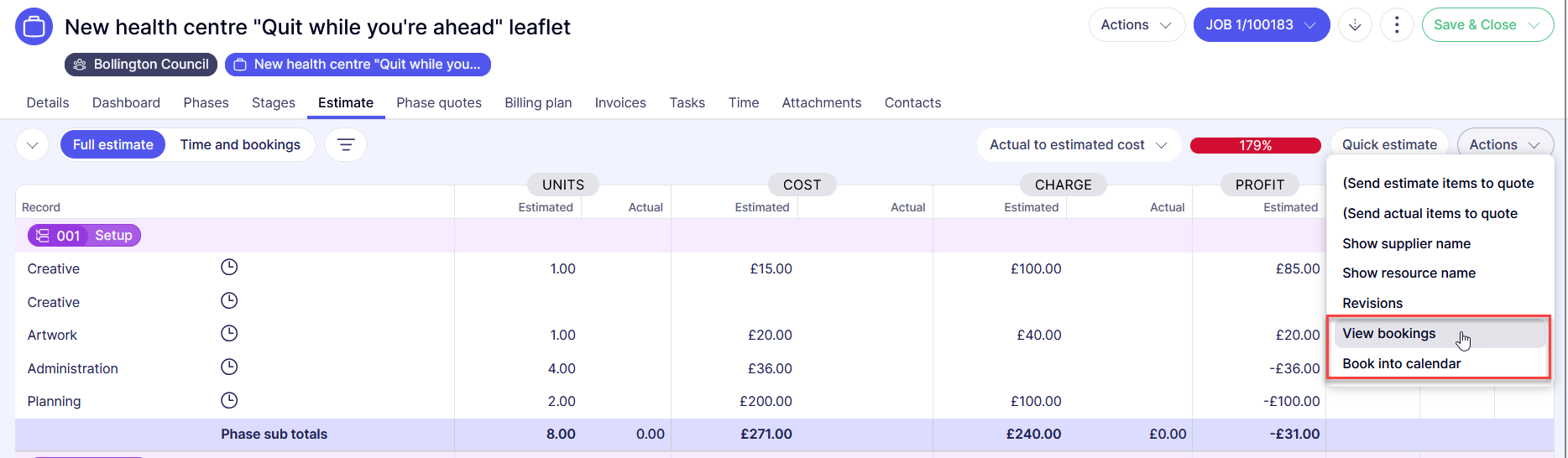 It is possible to access the calendar from within a job or phase. The calendar button on both job and phase estimate tab will allow you to view existing bookings and, if you have the permissions to do so, make a new booking: