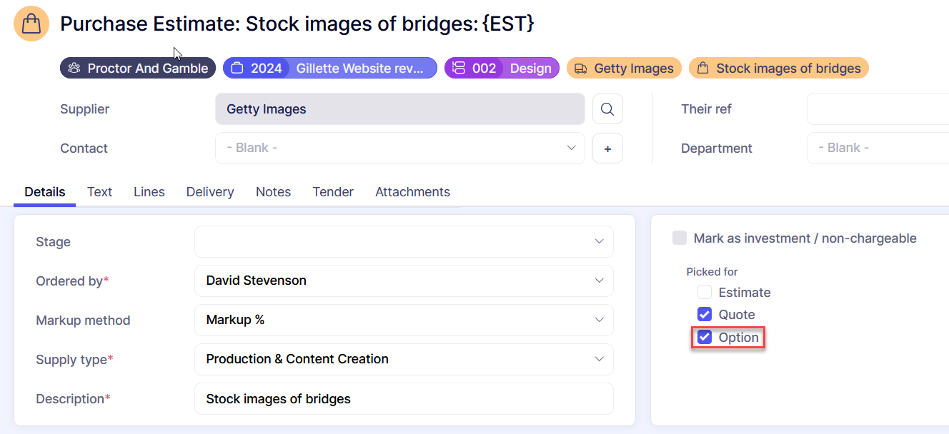 If you have options ticked to be active on the switches tab of company settings, then a purchase estimate and order can be marked as an ‘Option’. By doing this any quote generated from the estimate will automatically reflect the optional character of this purchase.