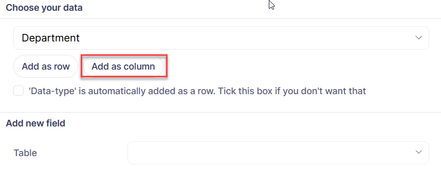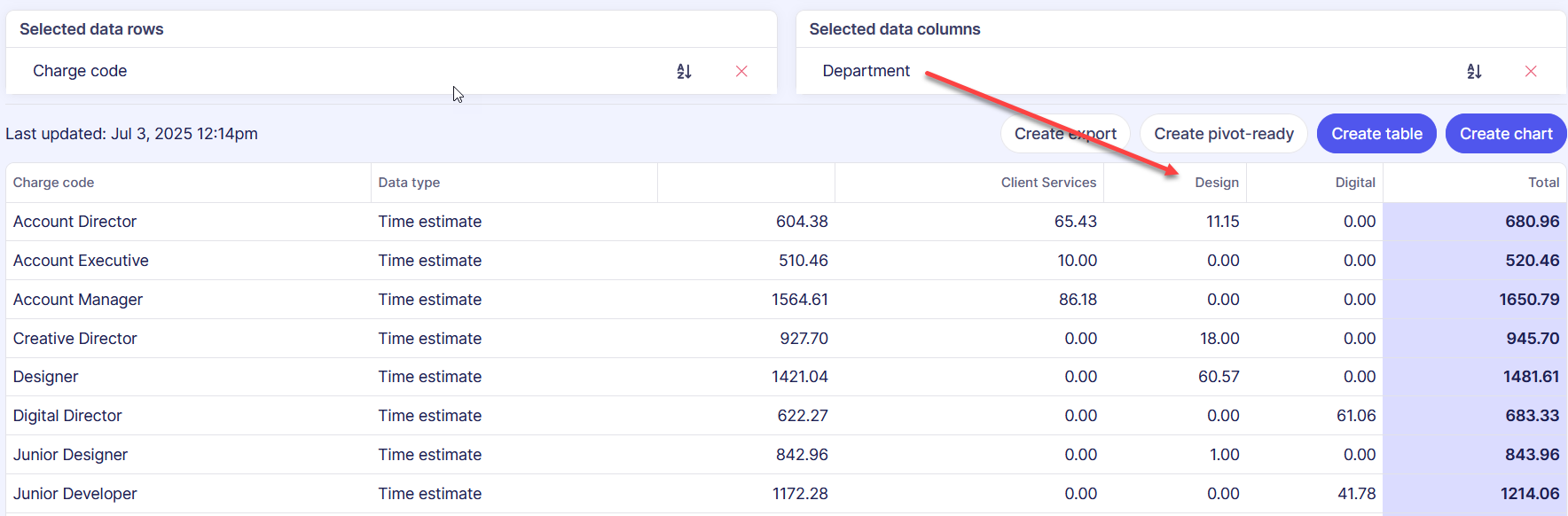 By default columns within Data viewer will represent the date and periods you have selected - typically days, weeks or months. However, there may be times when you're rather have the columns represent a data type such as teams or job types. To create a cross-tab of your data add a field as a column rather that as a row.