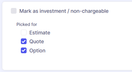 Note that doing so unticks the picked for estimate box. These are mutually exclusive - you can't have an option item that is included in the estimate total. When you build your quote from the estimate, this item will now create a quote line that is marked as an option.