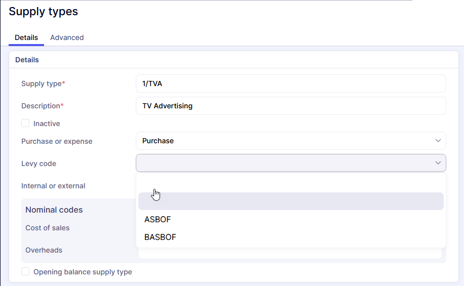 Once your levies are set up in file maintenance you can assign them to appropriate supply types in file maintenance by clicking on the new Levy code dropdown that is now shown in your supply type input form: