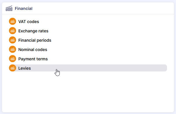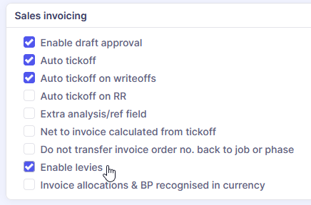Once you have ticked the option in company settings > switches > sales invoicing section you will find a new item in file maintenance called Levies.