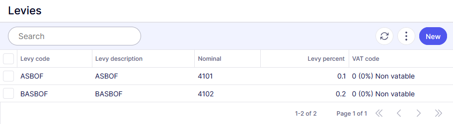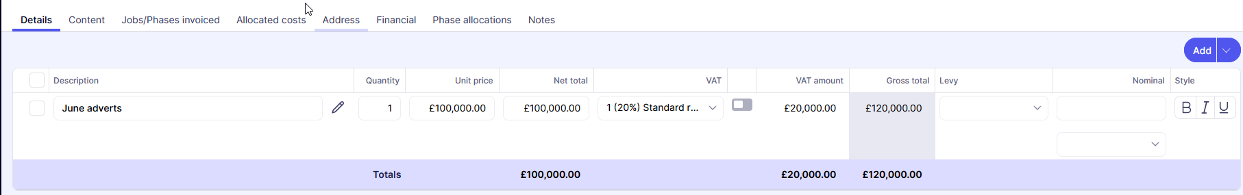 Note that a levy can be set for each line using the drop-down in the levy column of invoice line details. This should not be necessary though, if you have assigned the correct levy code to all appropriate supply types. The levy amount is calculated as the % rate of the net amount for all lines set to use a given levy code.