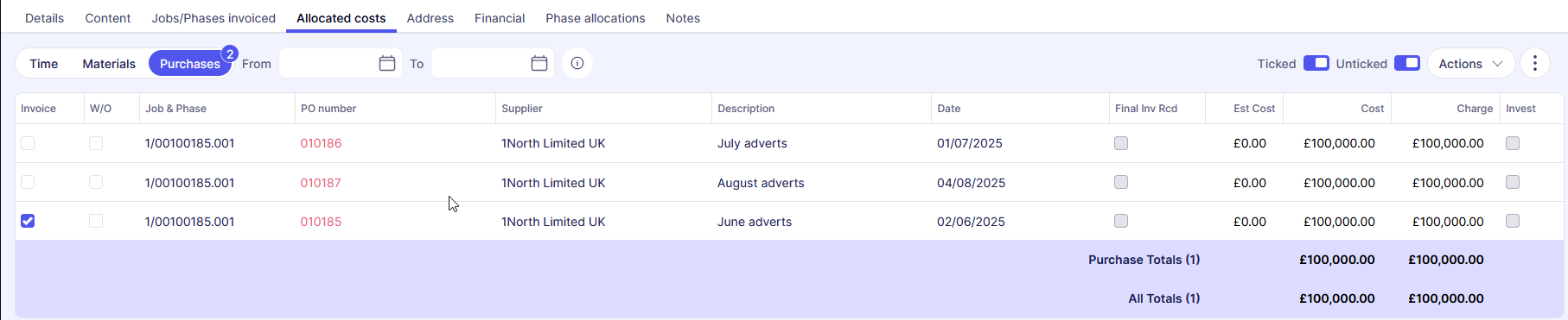 Now, when a draft invoice is prepared using actual costs as content an additional line will be added for any levy amounts required for purchase costs being billed: