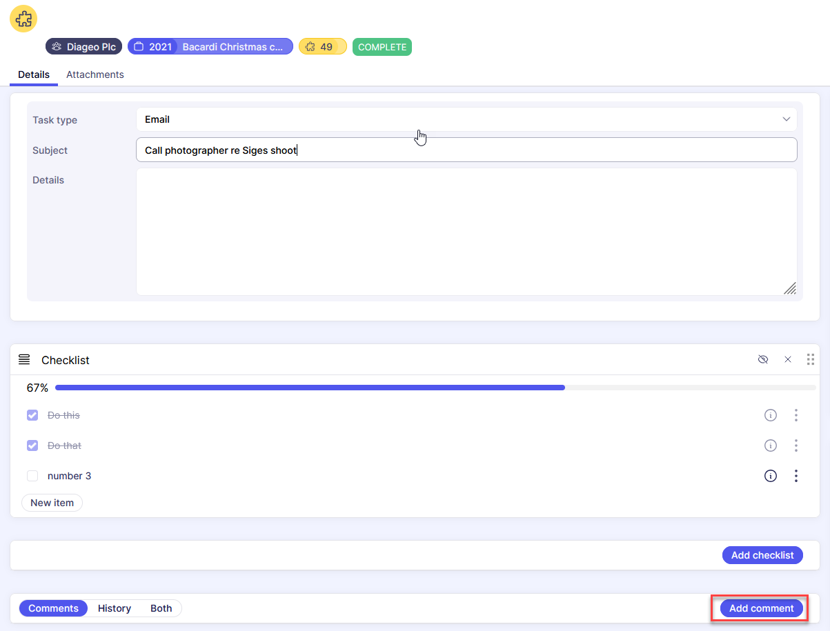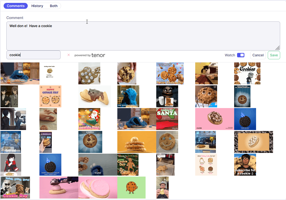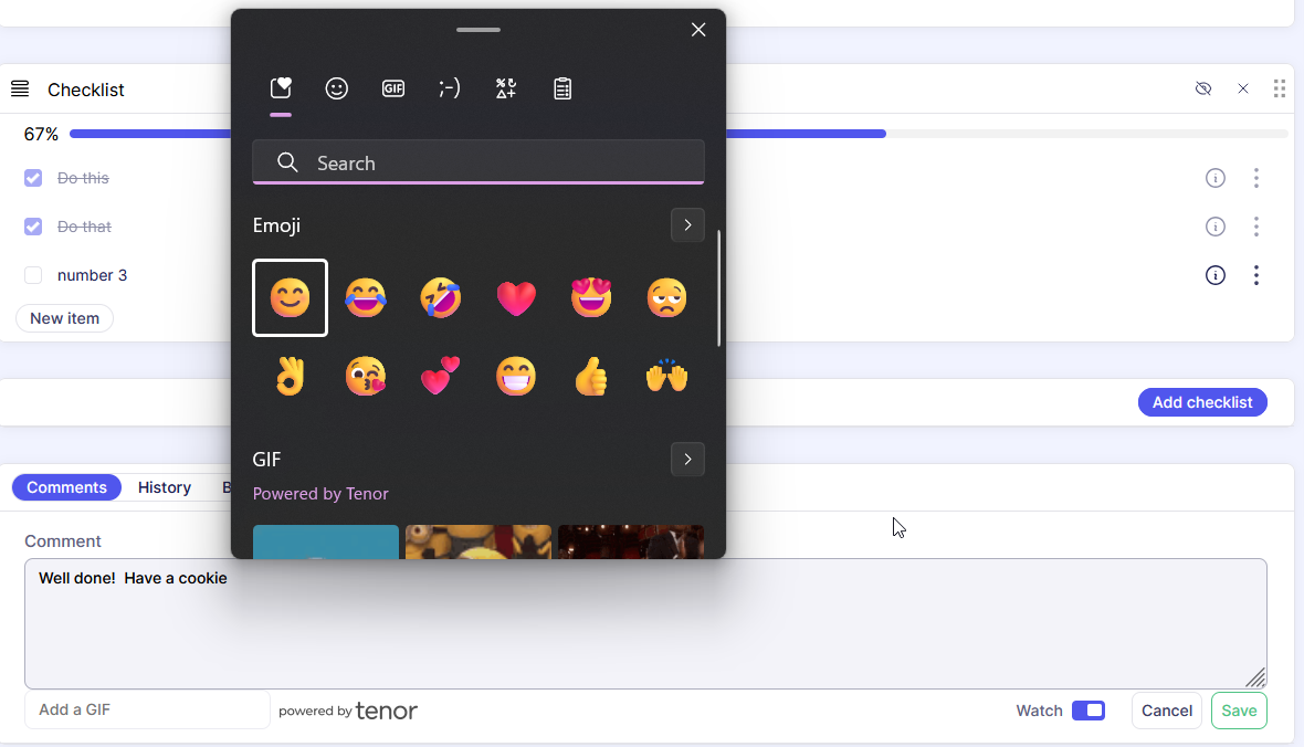 Comments added to tasks can include GIFs, just add a comment and type in some text to start searching for GIFs