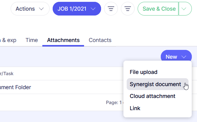 A user can create a document from any attachments tab (clients, jobs, phases, activities etc) in Synergist by clicking the 'New' button and selecting Synergist document: