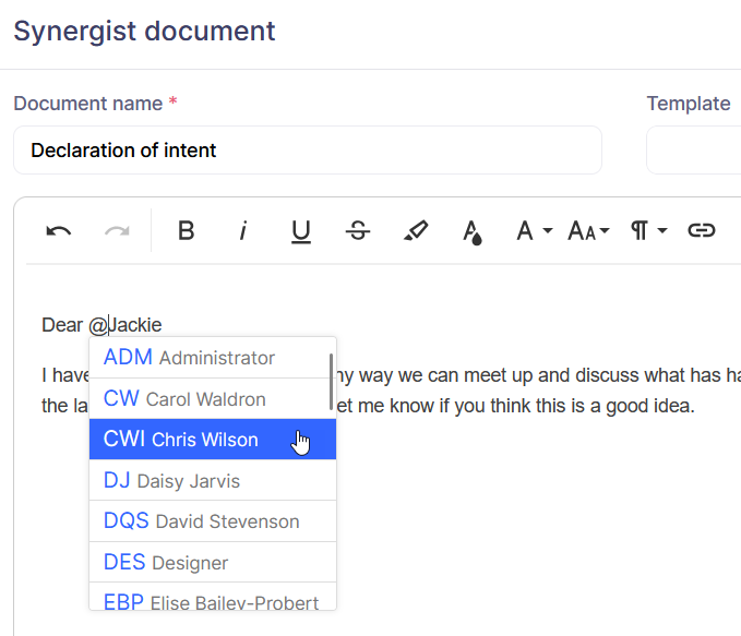 @ mentions are supported in Synergist html documents, just type @ and start typing the user's name to filter the list: