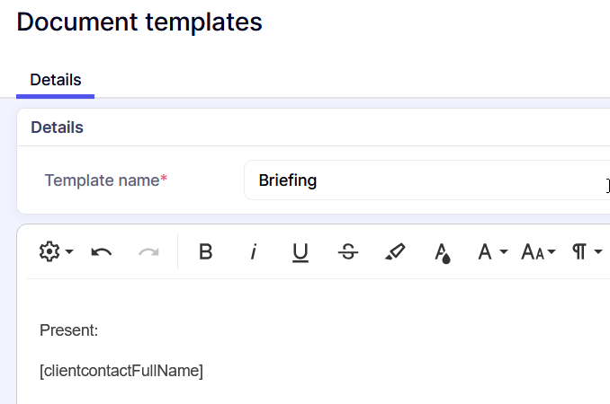 A new field is then added to the document template inside square parenthesis. When this template is used to create a new document, the contact name (along with all the other embedded fields already selected) will be automatically inserted into the document.