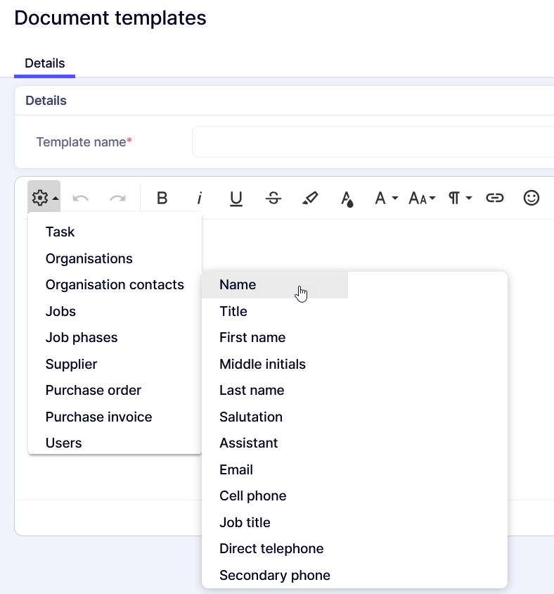 Note: Not all fields are available when using a template. For instance, you will need to create a document from within a job to access a job number.
